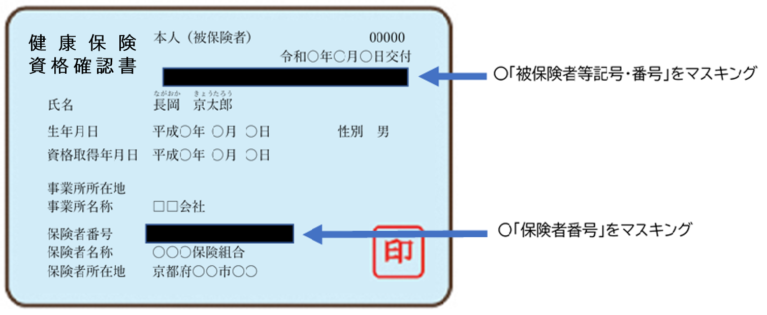 資格確認書のコピーを使用する場合は、【被保険者等記号・番号】等が見えないように隠した状態(マスキング)で同封してください。