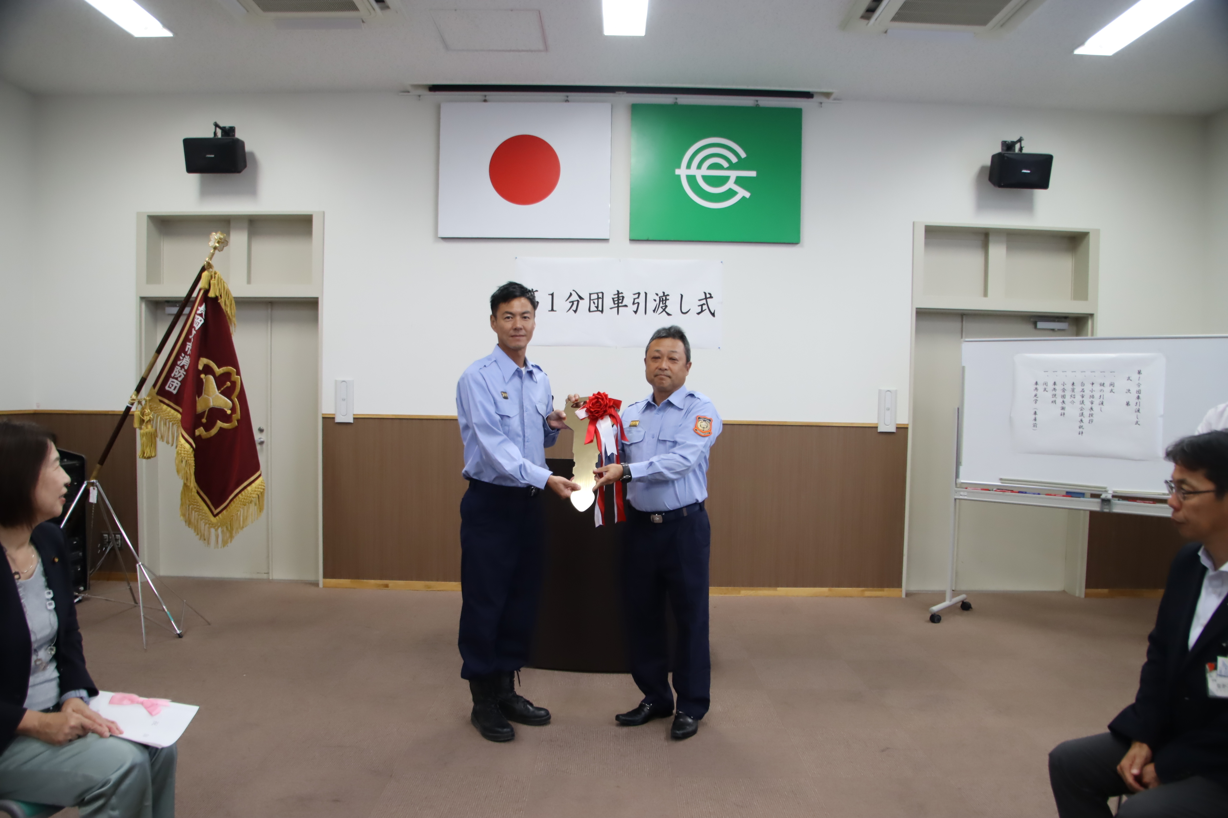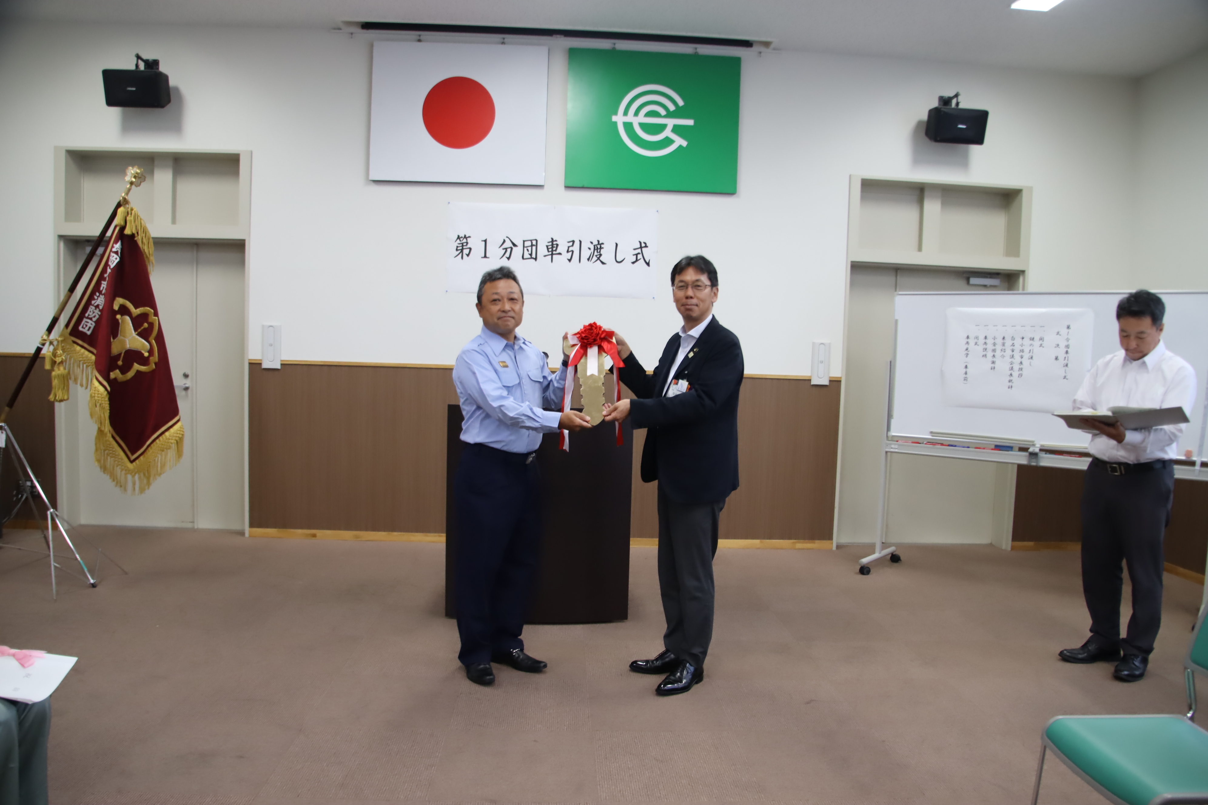 小倉消防団長から三宅第1分団長へ鍵の受渡しが行われました。