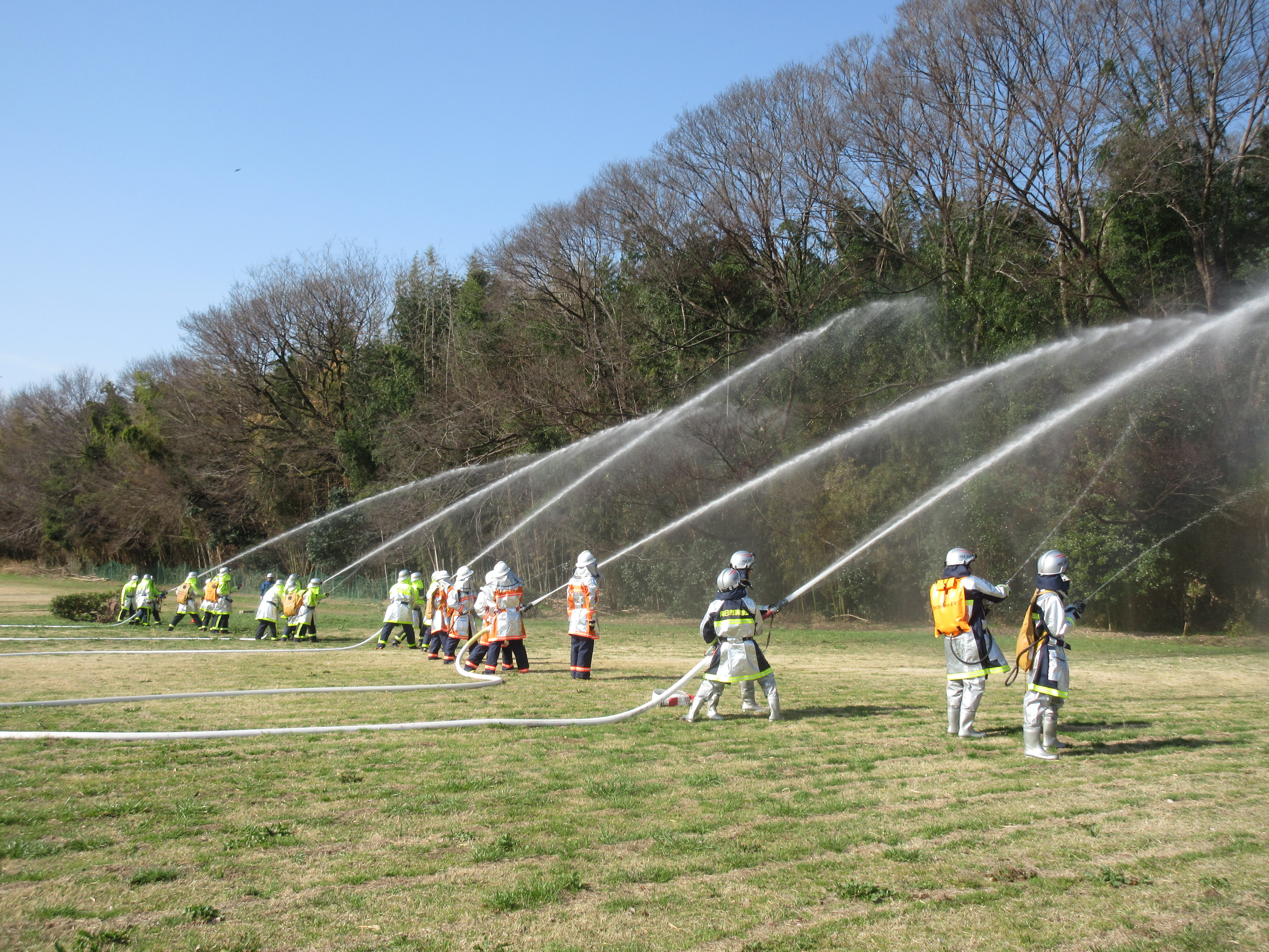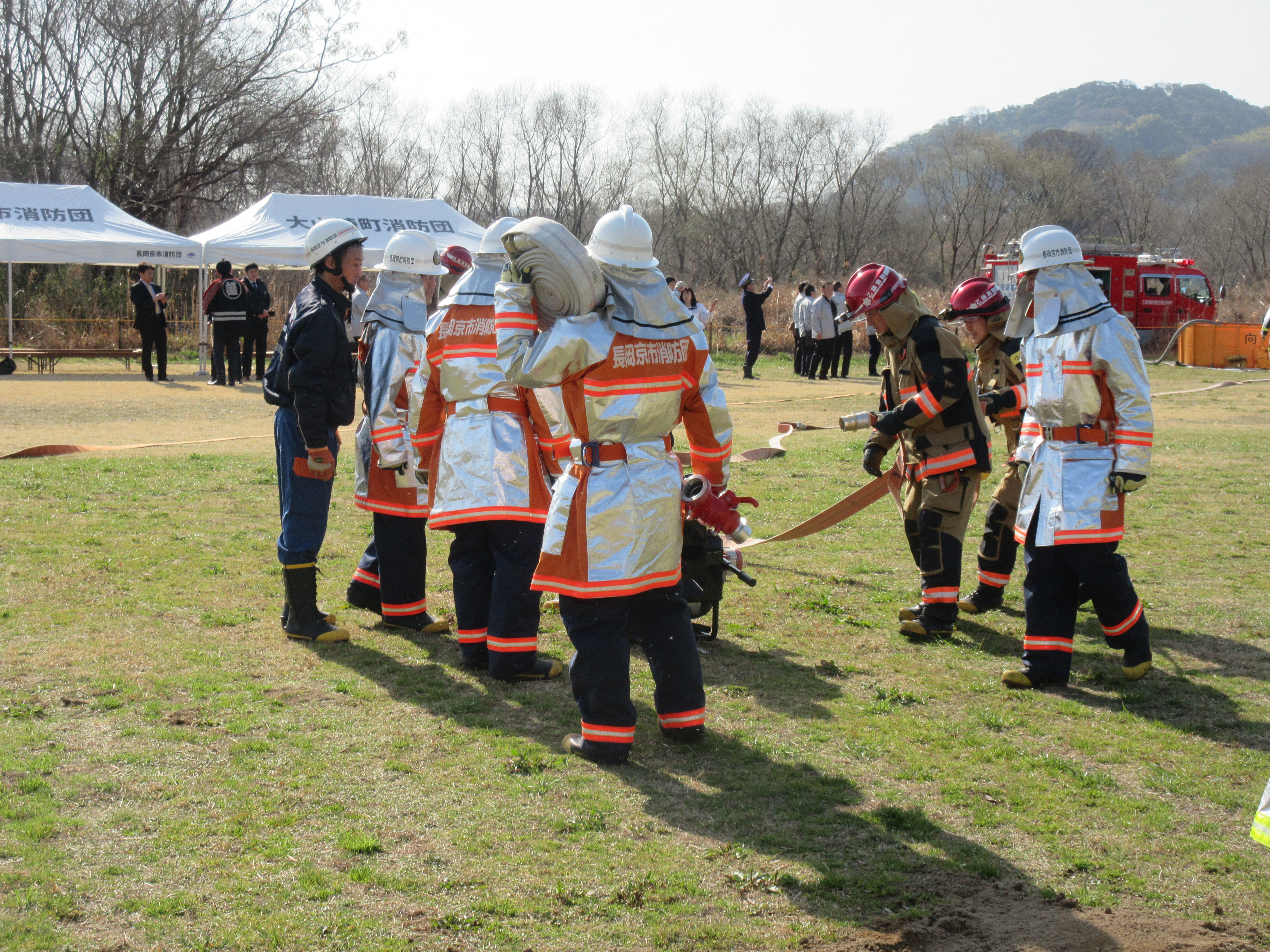 令和8年3月1日(日曜日)春季火災予防運動期間中の一環として、京都府消防協会乙訓支部主催による乙訓二市一町(長岡京市・向日市・大山崎町)消防防災相互応援協定に基づく消防団の総合消防訓練を桂川河川敷公園において実施しました。