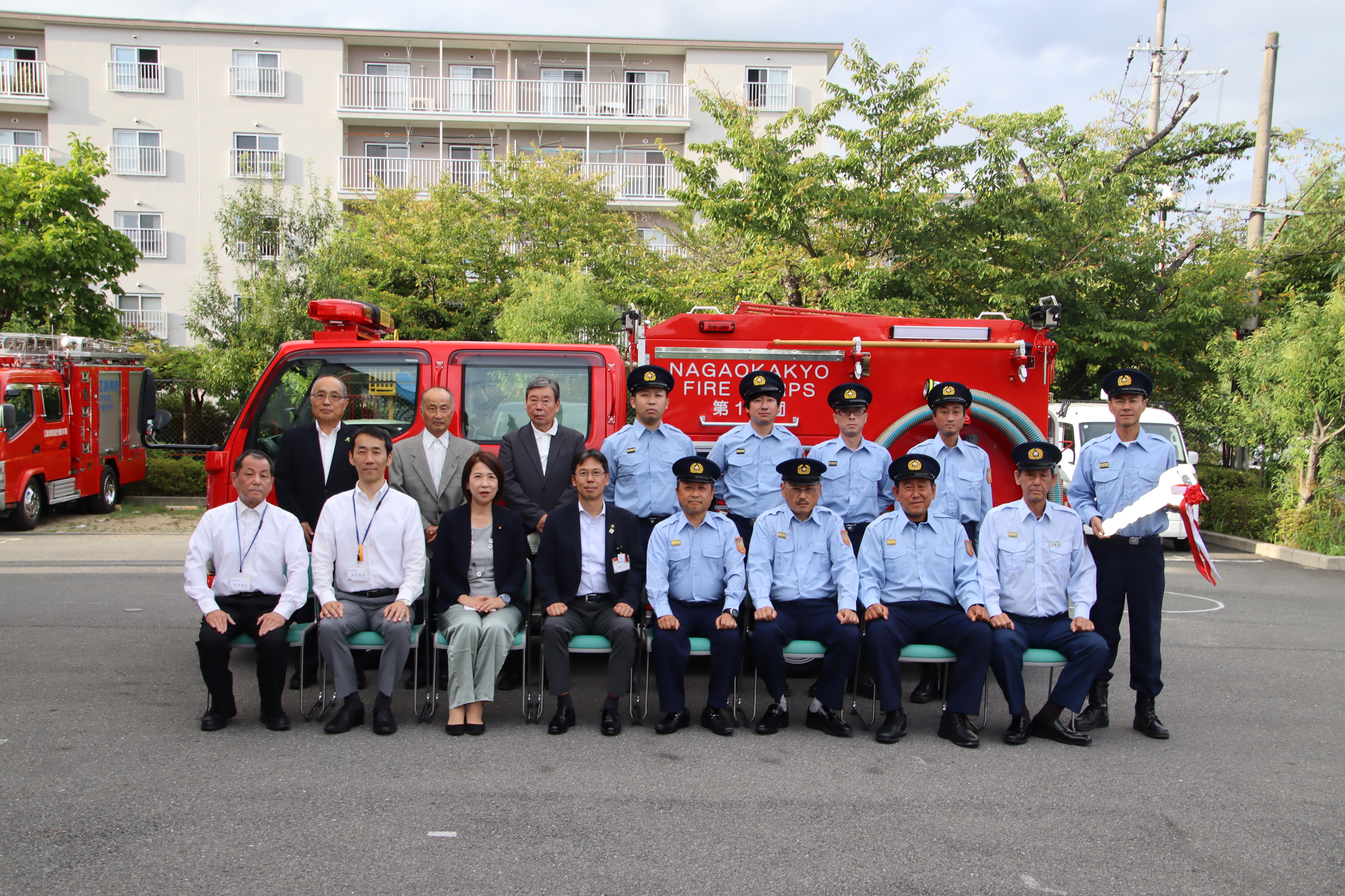 長岡京消防署敷地内で第1分団車の記念撮影を行いました。