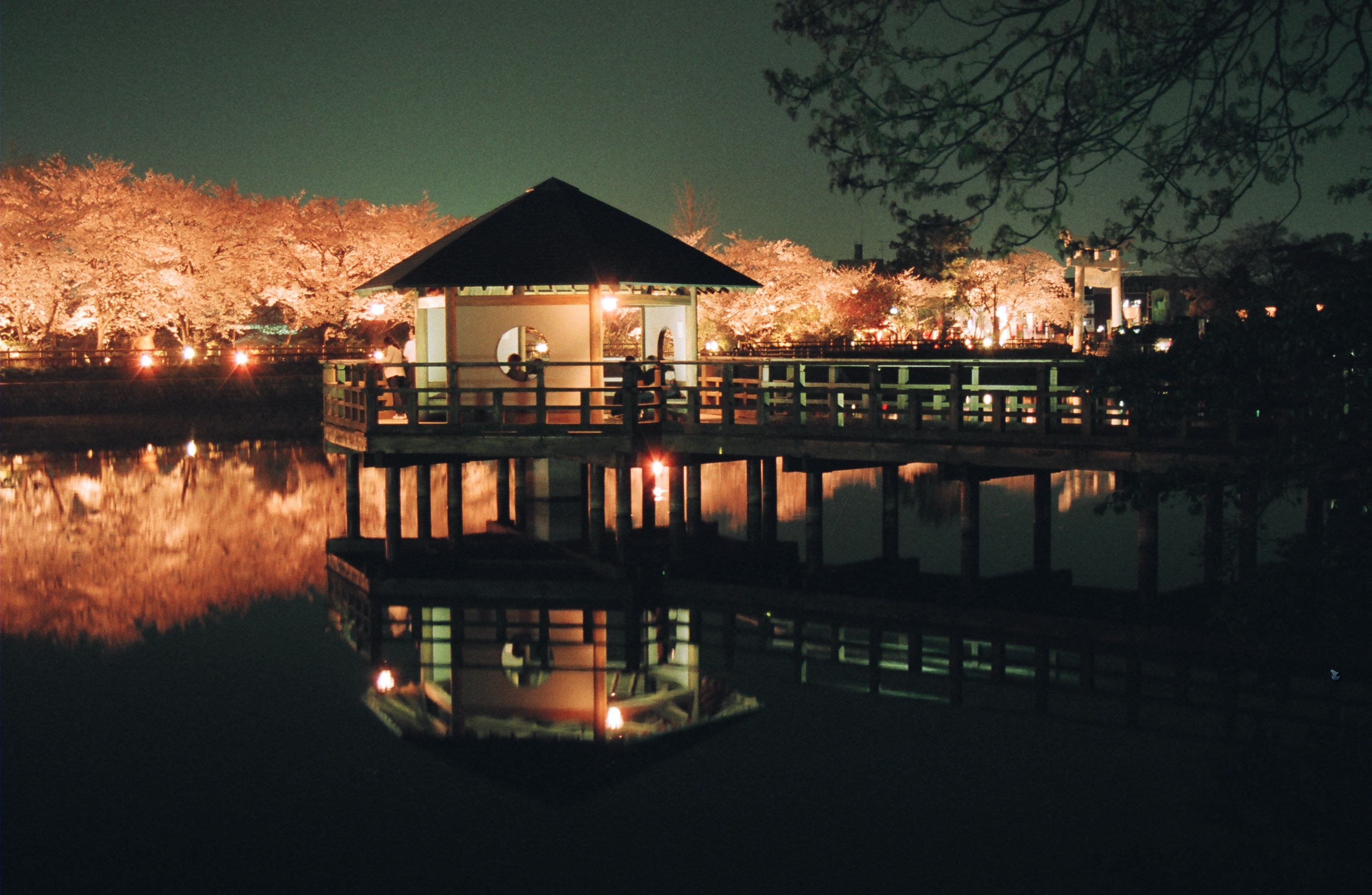 美しく照らされた桜が水面に映り、幻想的な風景を楽しめます。