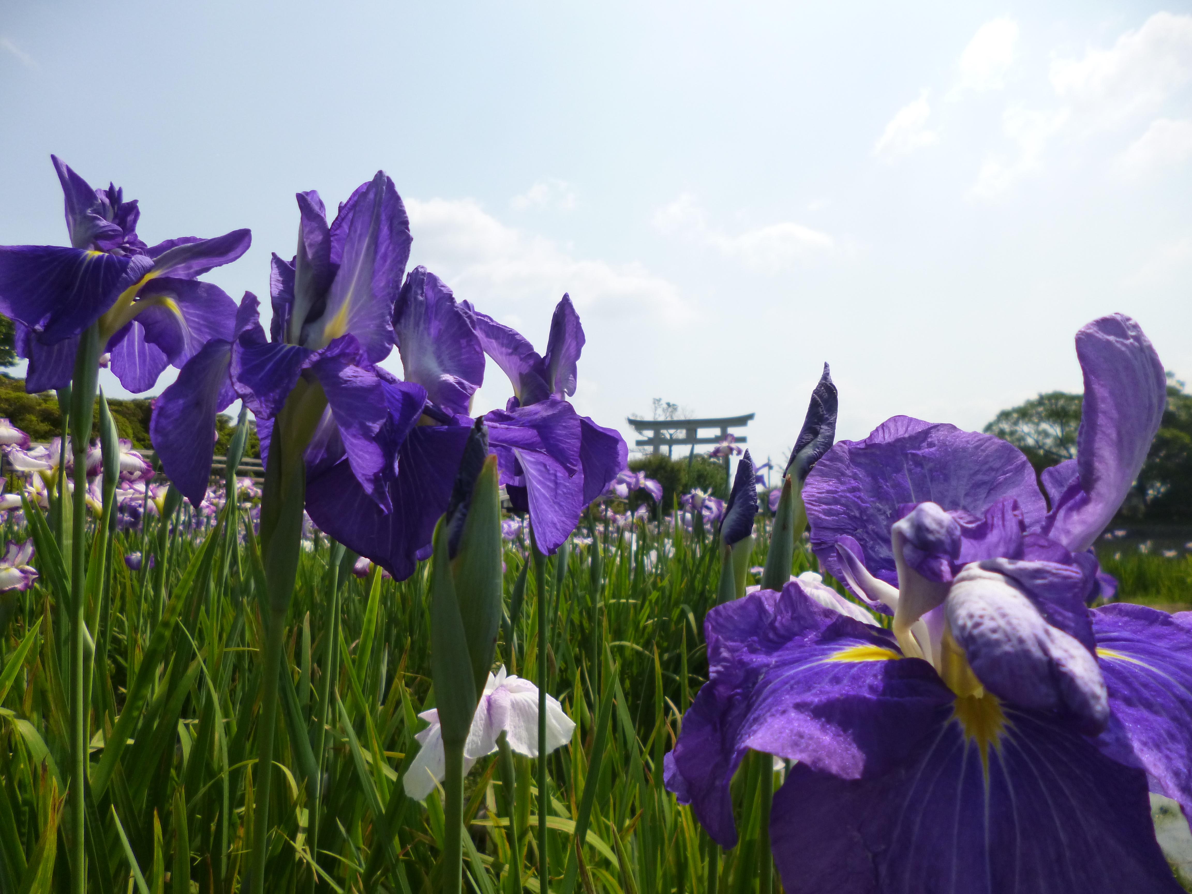 初夏にカキツバタの鮮やかな紫色とのコントラストが見られます。