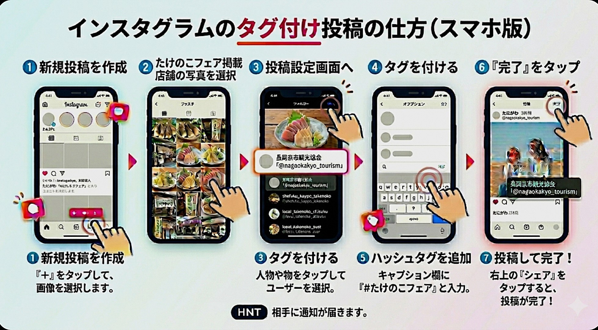 参加店舗で飲食や買い物をして写真を撮影し、長岡京市観光協会のインスタアカウントをフォロー&タグ付けして「#たけのこフェア」をつけて投稿するだけで素敵なプレゼントが当たるチャンス!
