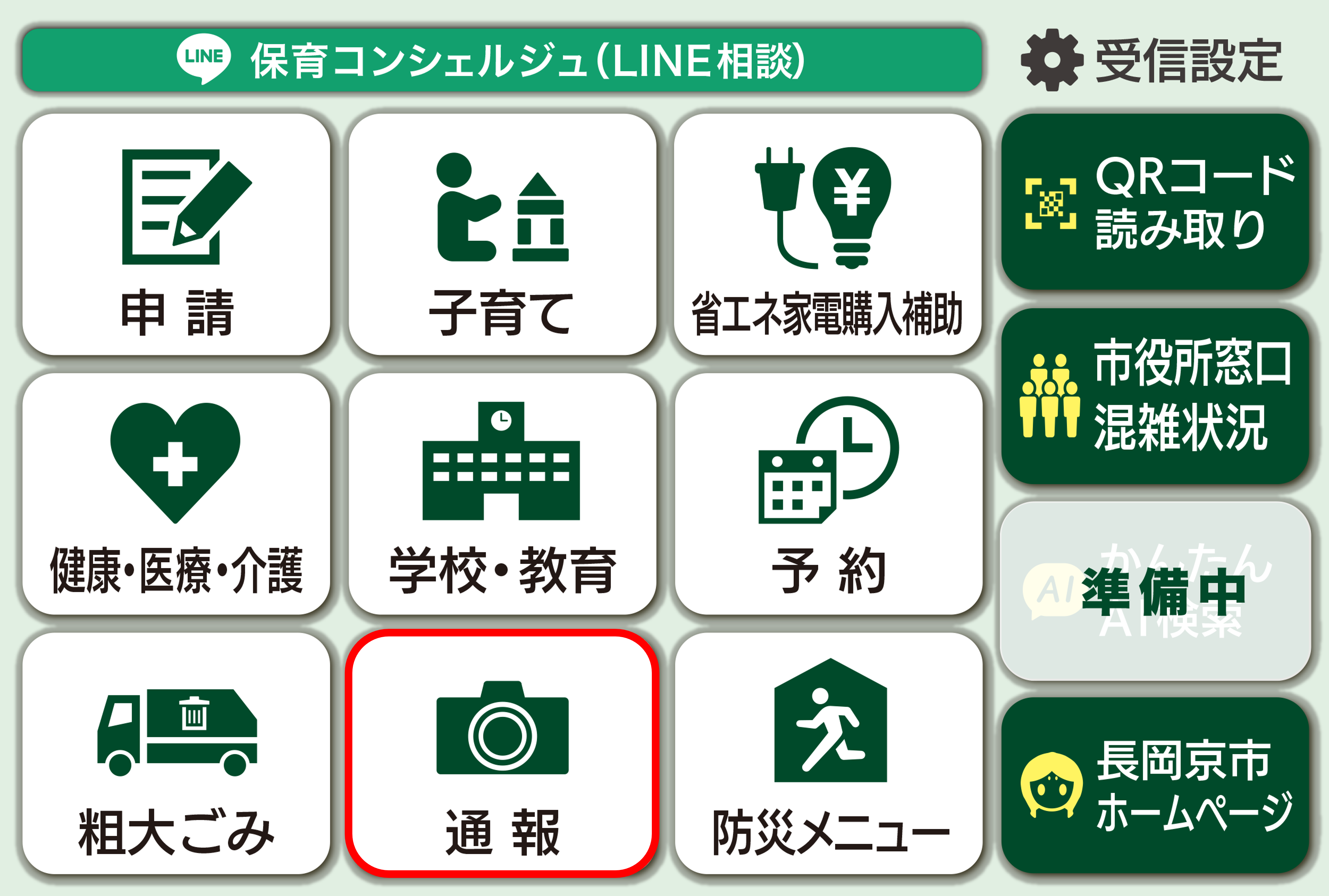 長岡京市LINE公式アカウントの基本メニューより「通報」を押してください。