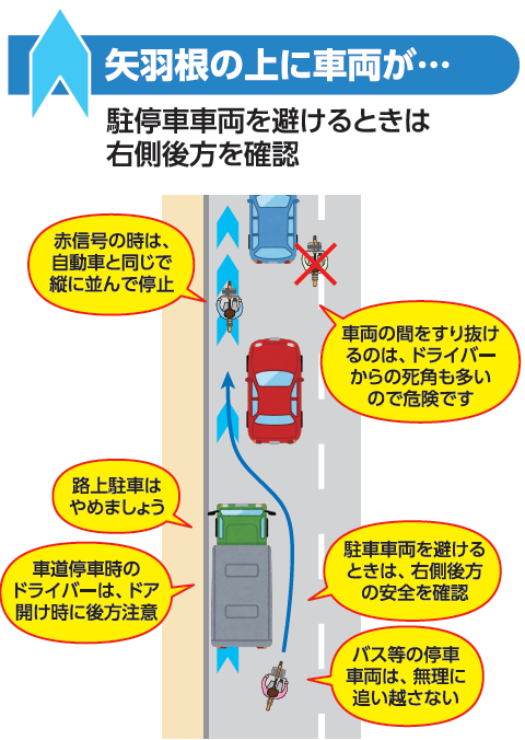 ・矢羽根に沿って車道の左端を通行しましょう。