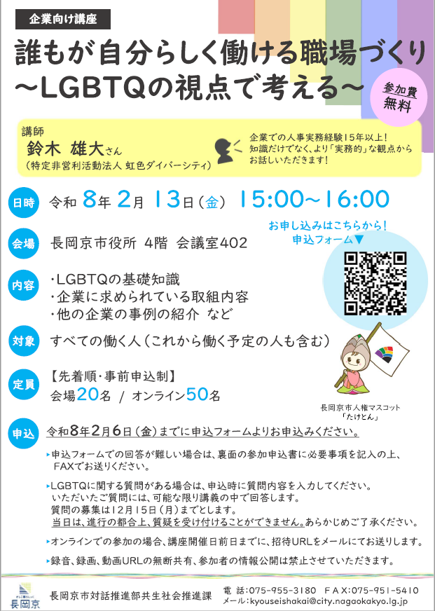 企業向け性の多様性講座「誰もが自分らしく働ける職場づくり〜LGBTQの視点で考える〜」(令和8年2月13日開催)