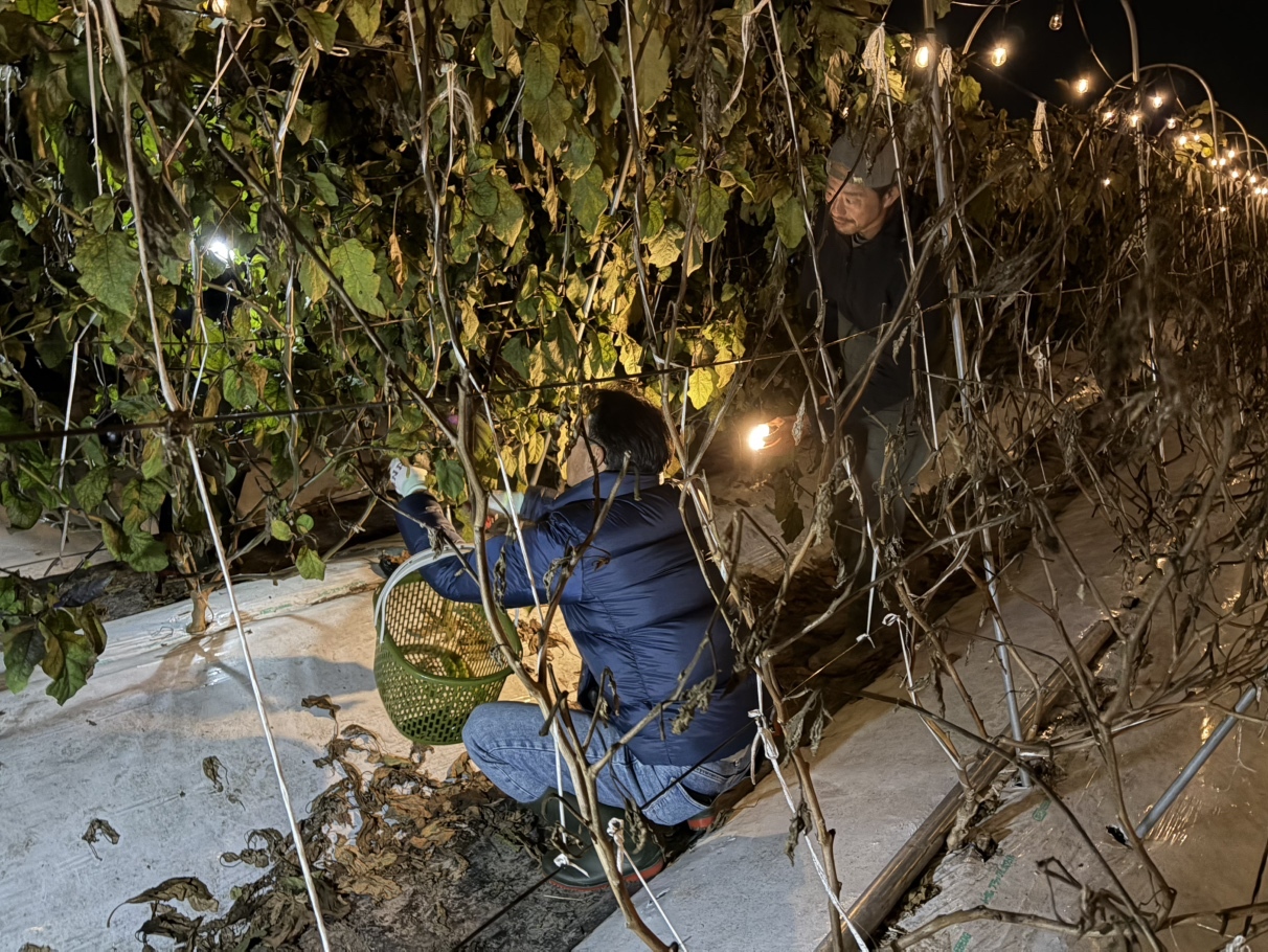 まずは、数多くの野菜が植えられた畝が整然と並び、電球に照らされている風景はとっても幻想的で美しい。その間を、長靴を履いて分け入り、ハサミを片手に収穫をしていく。
