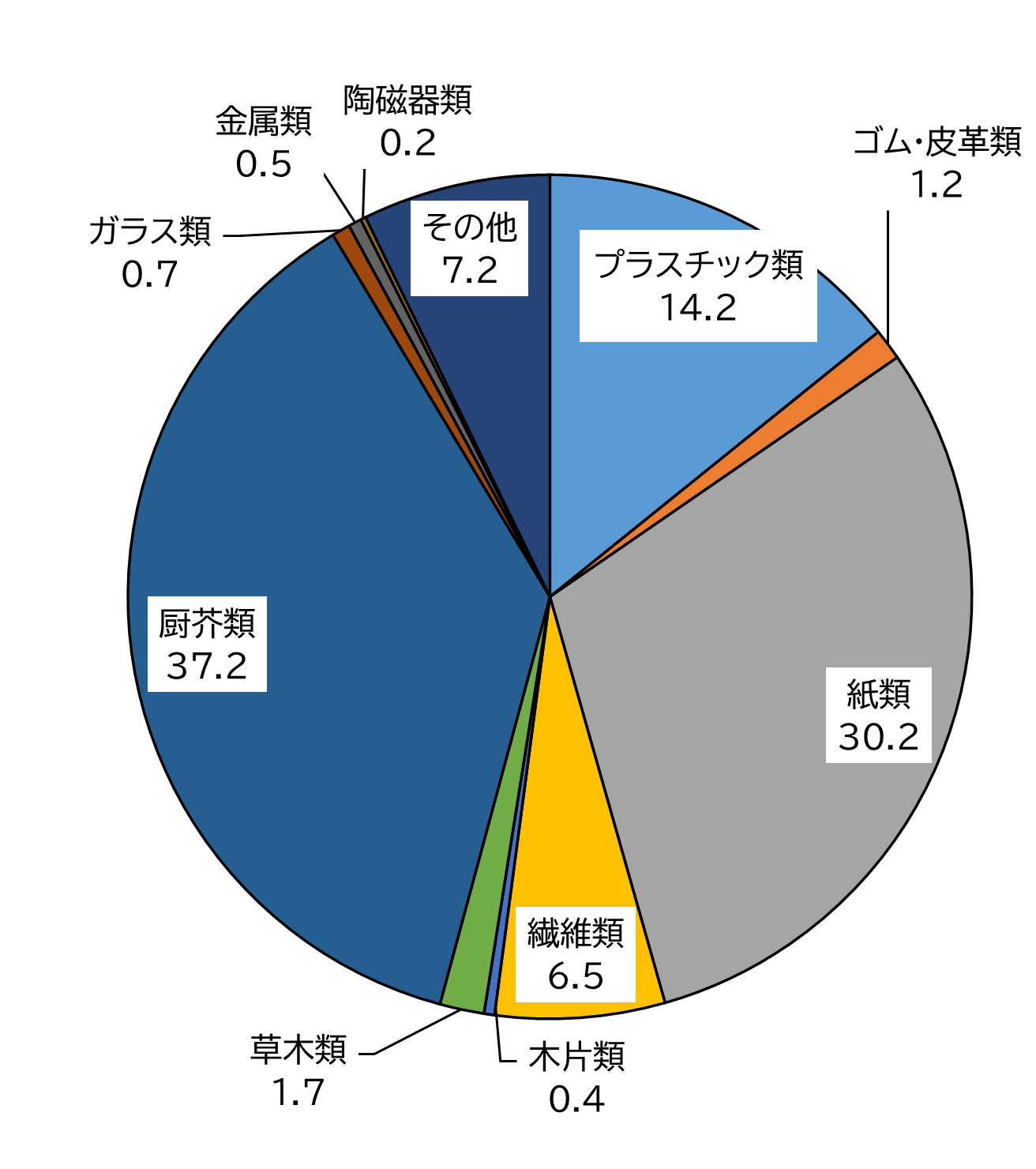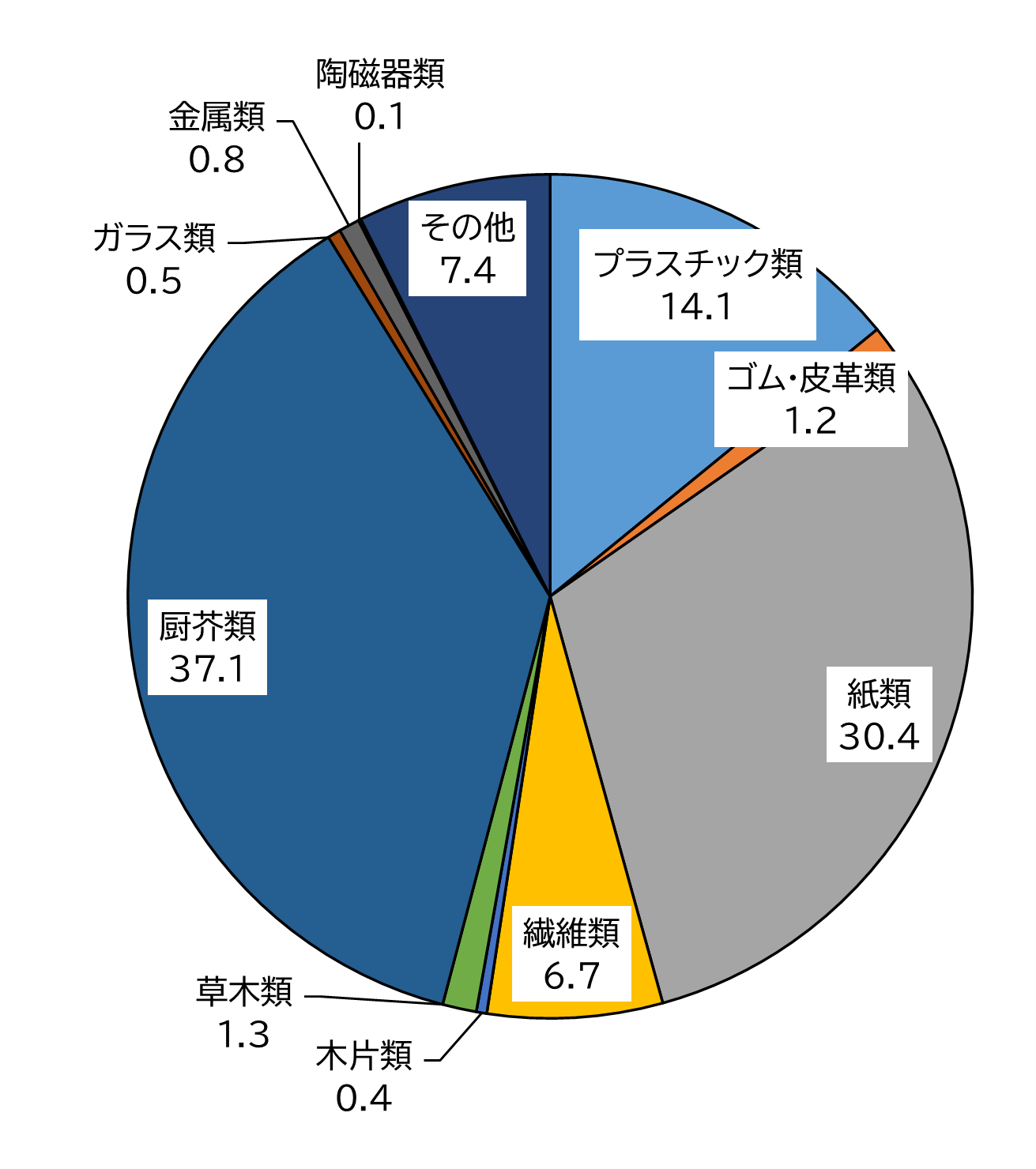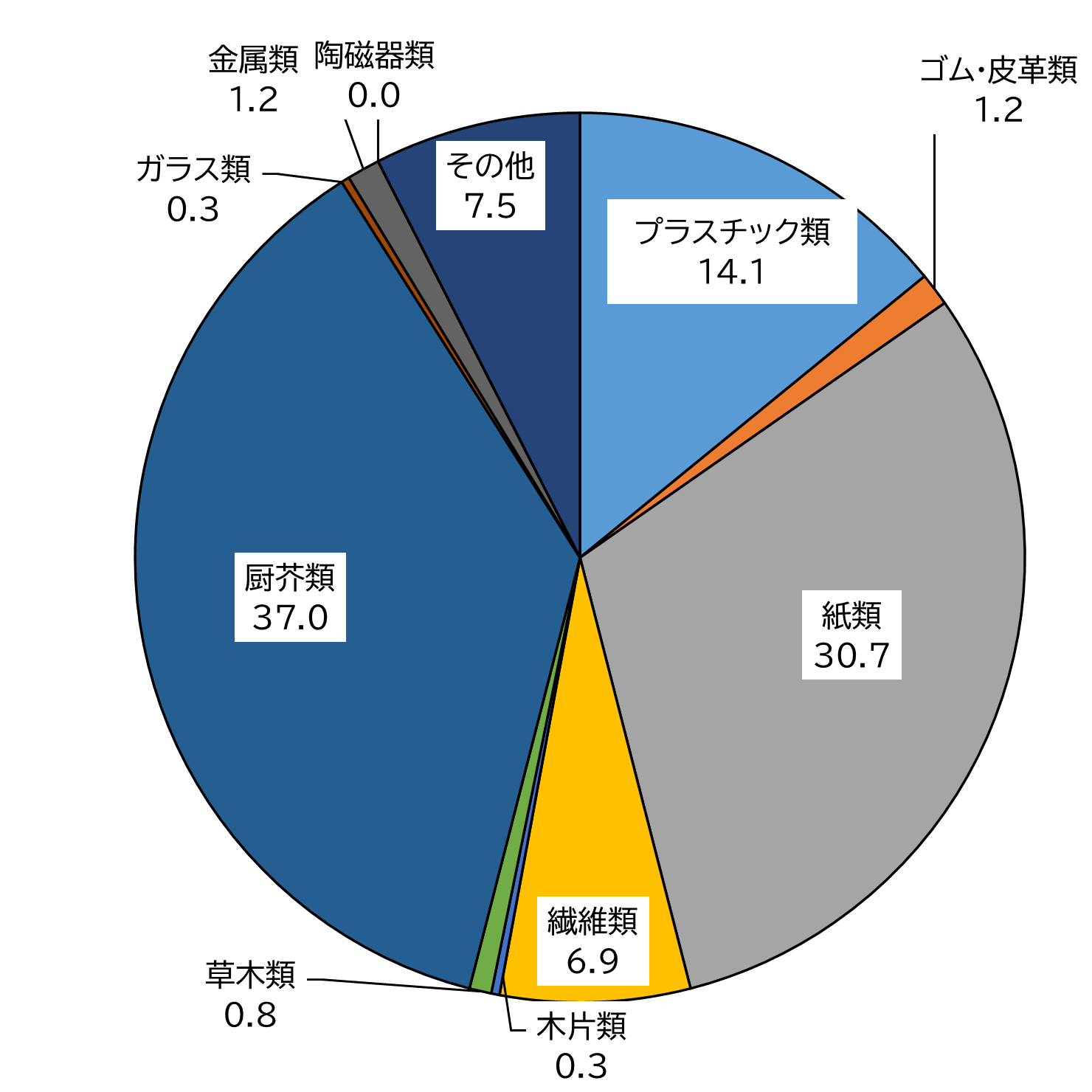 ・主要なものとして、プラスチック類が約14%、紙類が約30%、厨芥類が約37%でした。