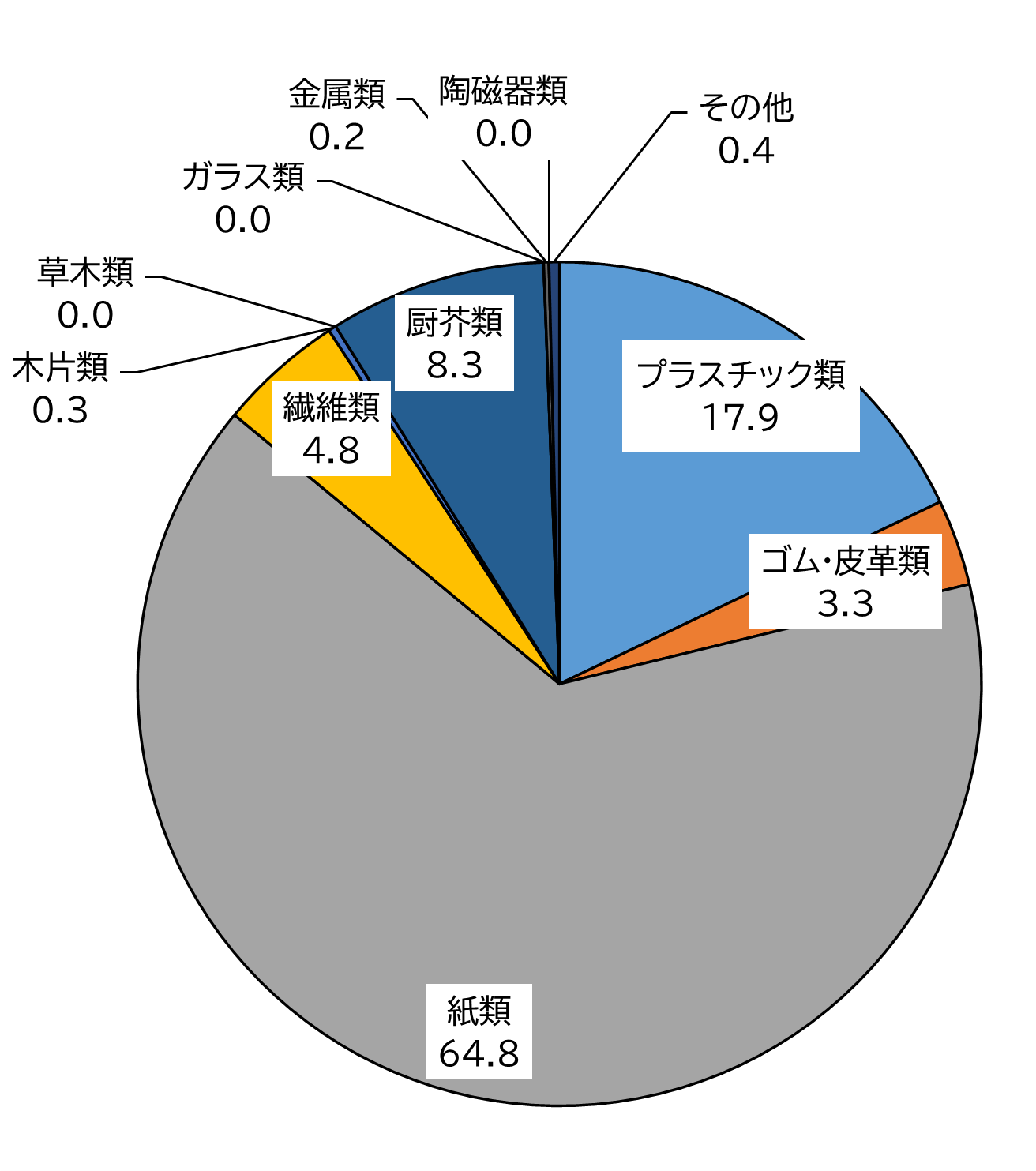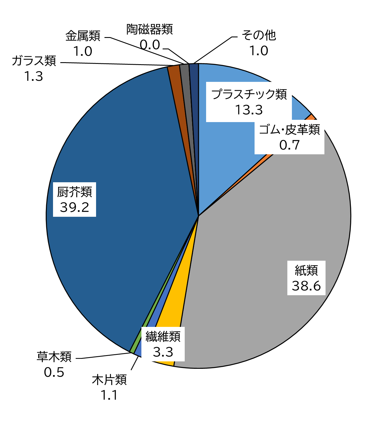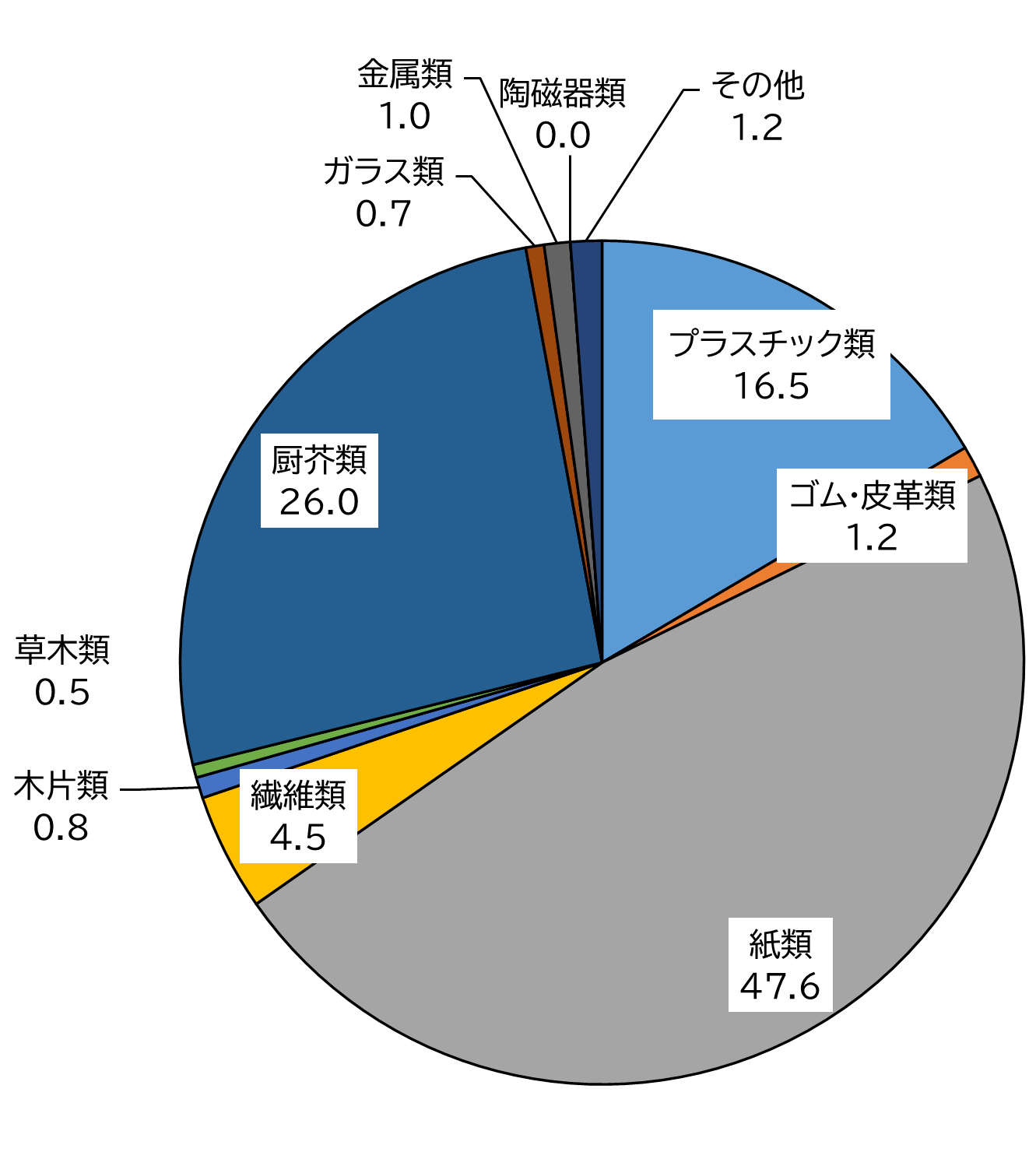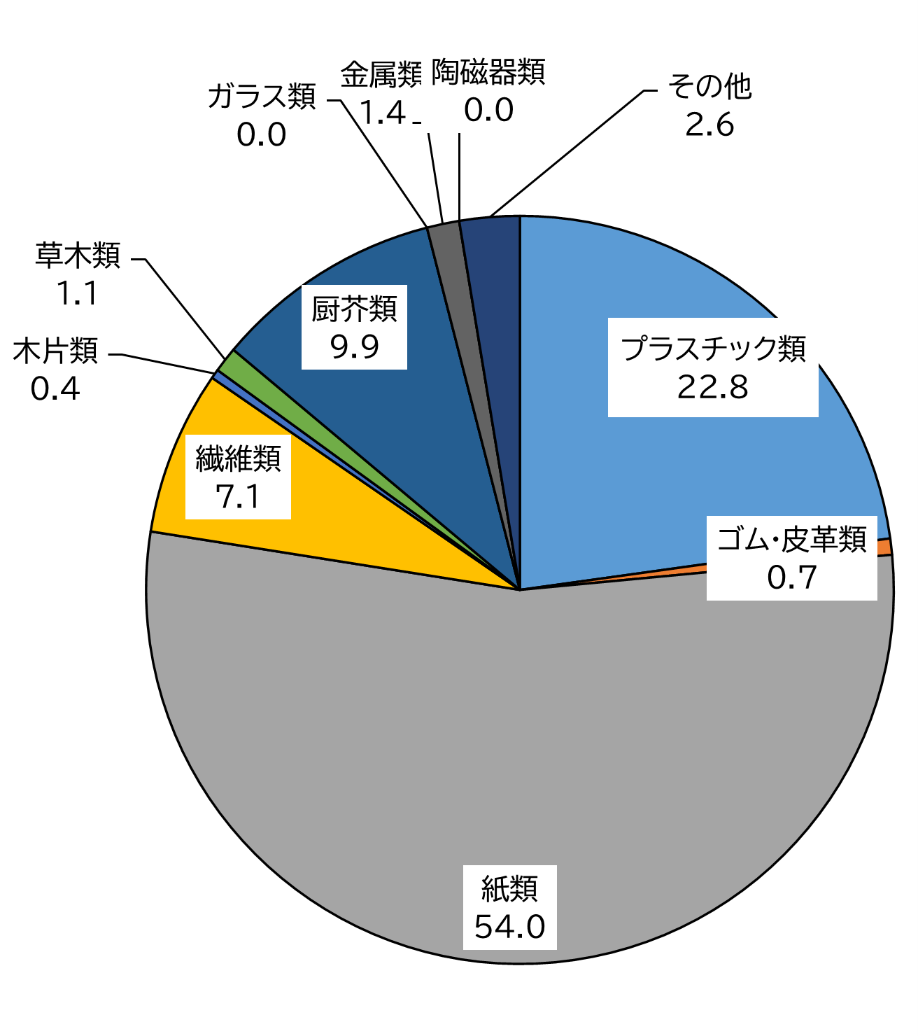 ・主要なものとして、プラスチック類が約14%、紙類が約30%、厨芥類が約37%でした。