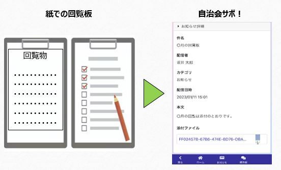・回覧される文書や自治会からのお知らせを登録したスマートフォンなどでいつもで、どこでも確認できる