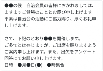 ・配信する側(会長など)は、日時や集合場所などの情報と参加の可否を尋ねるアンケートを付け、受け取る側(自治会員など)に配信します。