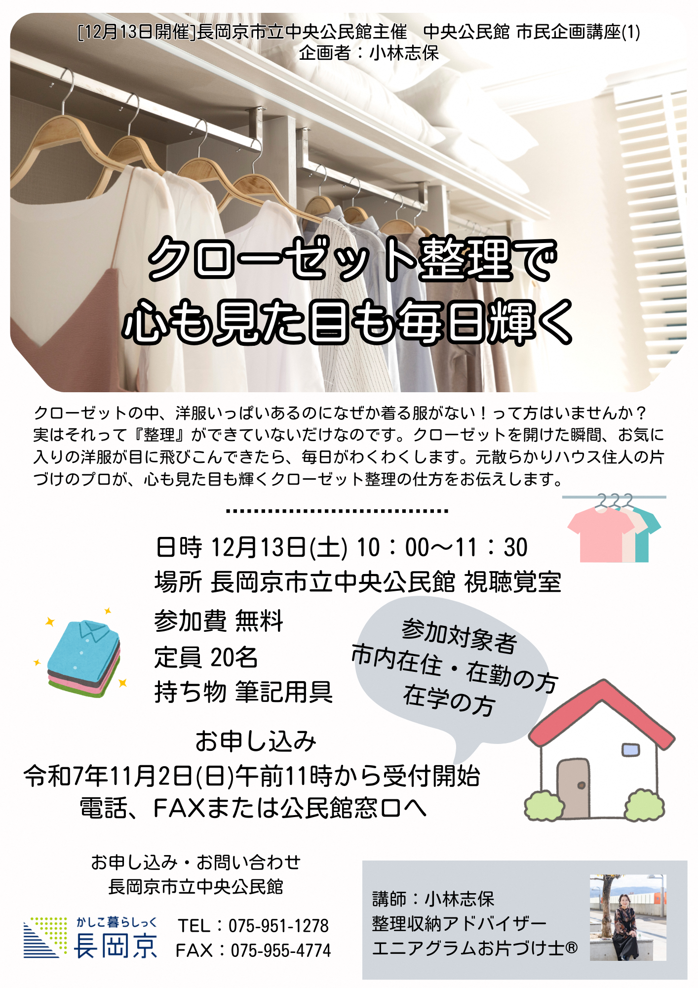 【募集】中央公民館 市民企画講座(1)「クローゼット整理で心も見た目も毎日輝く」