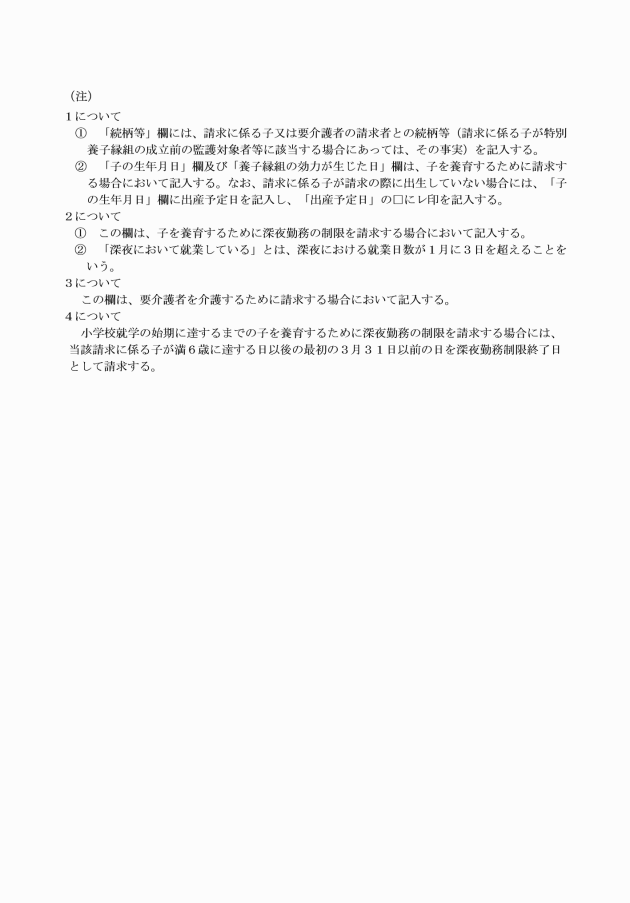 第12条の3 条例第8条の2第1項の規定により深夜における勤務の制限を請求する職員は、深夜勤務制限請求書(別記様式第1号)により、深夜における勤務の制限を請求する1の期間(6月以内の期間に限る。以下「深夜勤務制限期間」という。)について、その初日(以下「深夜勤務制限開始日」という。)及び末日(以下「深夜勤務制限終了日」という。)とする日を明らかにして、深夜勤務制限開始日の1月前までに請求を行うものとする。