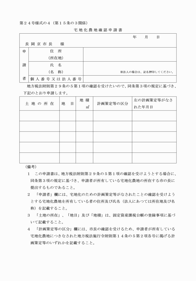 第15条の3 条例附則第13条の4第4項の規定による宅地化農地確認申請書は第24号様式の4による。