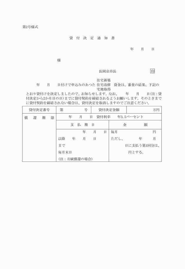 第1条 長岡京市住宅新築資金等貸付条例(昭和51年長岡京市条例第17号。以下「条例」という。)第4条第2項の貸付対象住宅等の規模等については、次に掲げるとおりとする。