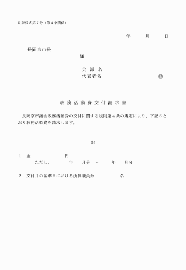 第4条 会派の代表者は、政務活動費の交付日の20日前までに、市長に対し政務活動費交付請求書(別記様式第7号)を提出するものとする。
