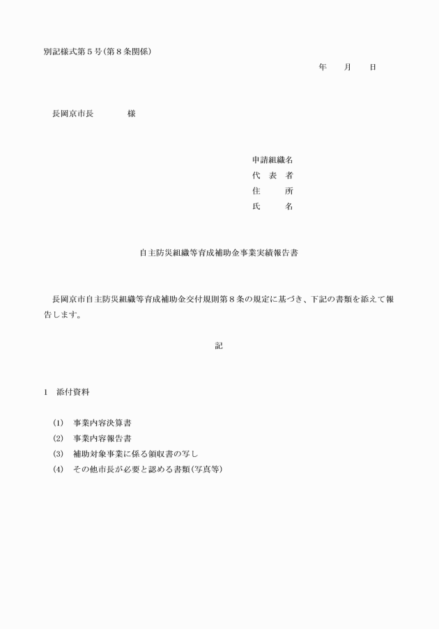 第8条 補助金の交付決定を受けた者(以下「補助事業者」という。)は、自主防災組織等育成補助金事業実績報告書(別記様式第5号)により、次に掲げる書類を添付して、当該年度の3月31日までに市長に提出しなければならない。